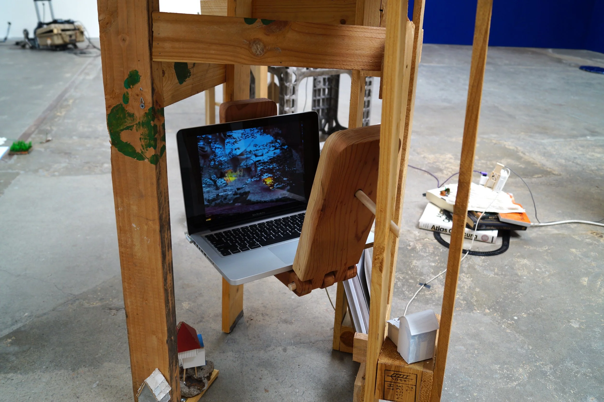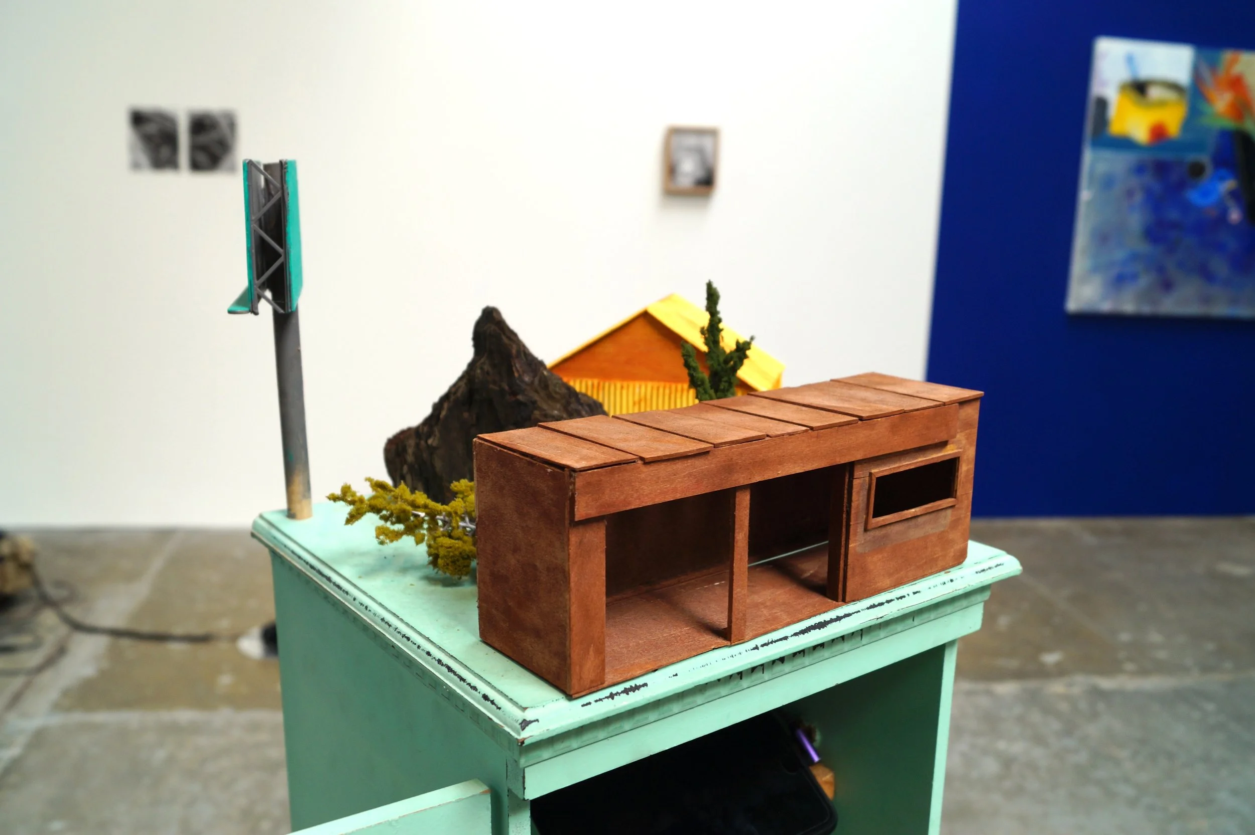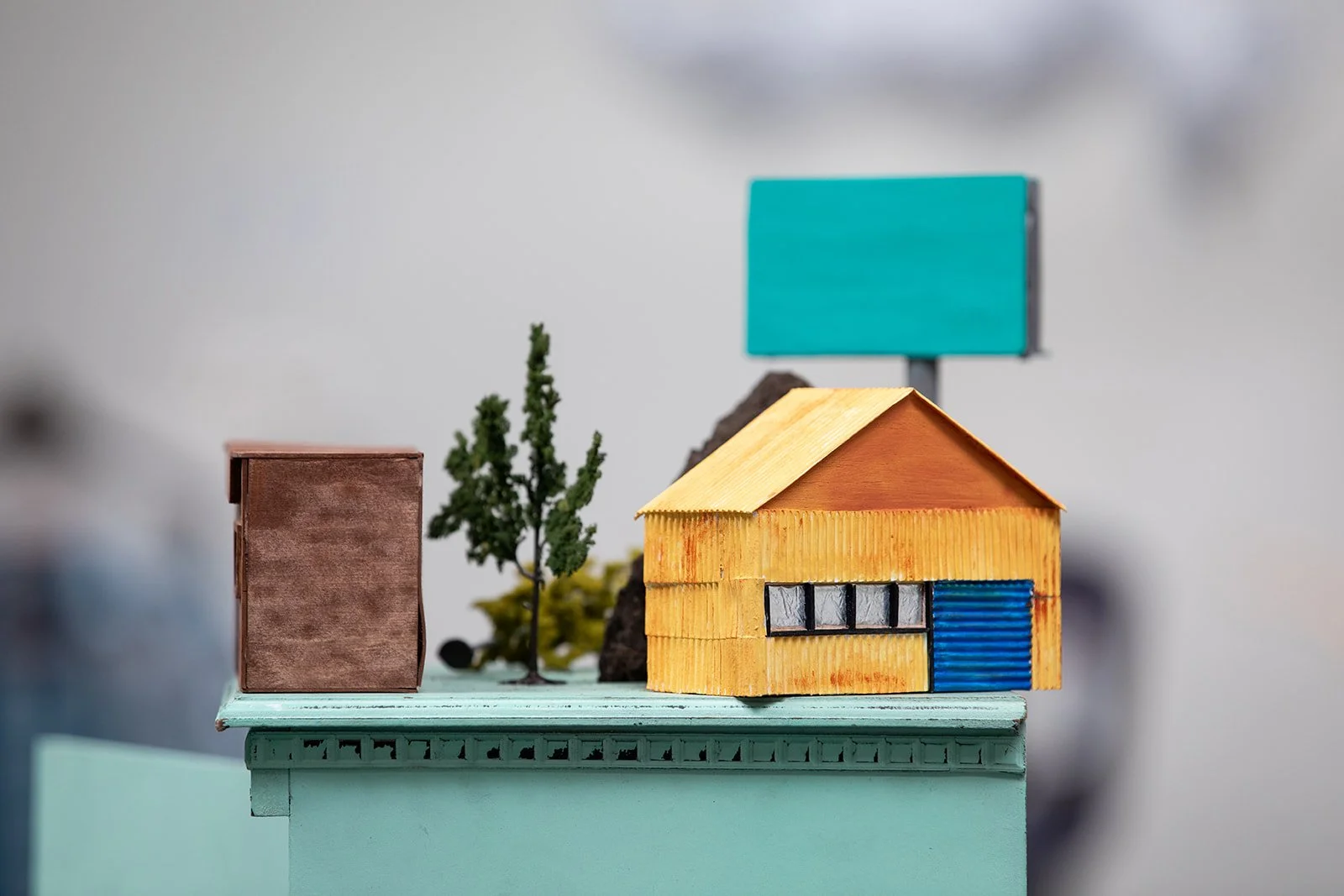 Of Sedimental Skin is a multi-piece installation comprised of different architectural miniatures located on three adjacent stages, each with their own accompanying video dialogue (see Fermented Landscapes and Ticks on the Ethernet Cable). These miniatures are able to be interacted (tactility encouraged) with and can freely be moved on or around the three stages by viewers, performing a physical change in the landscape.