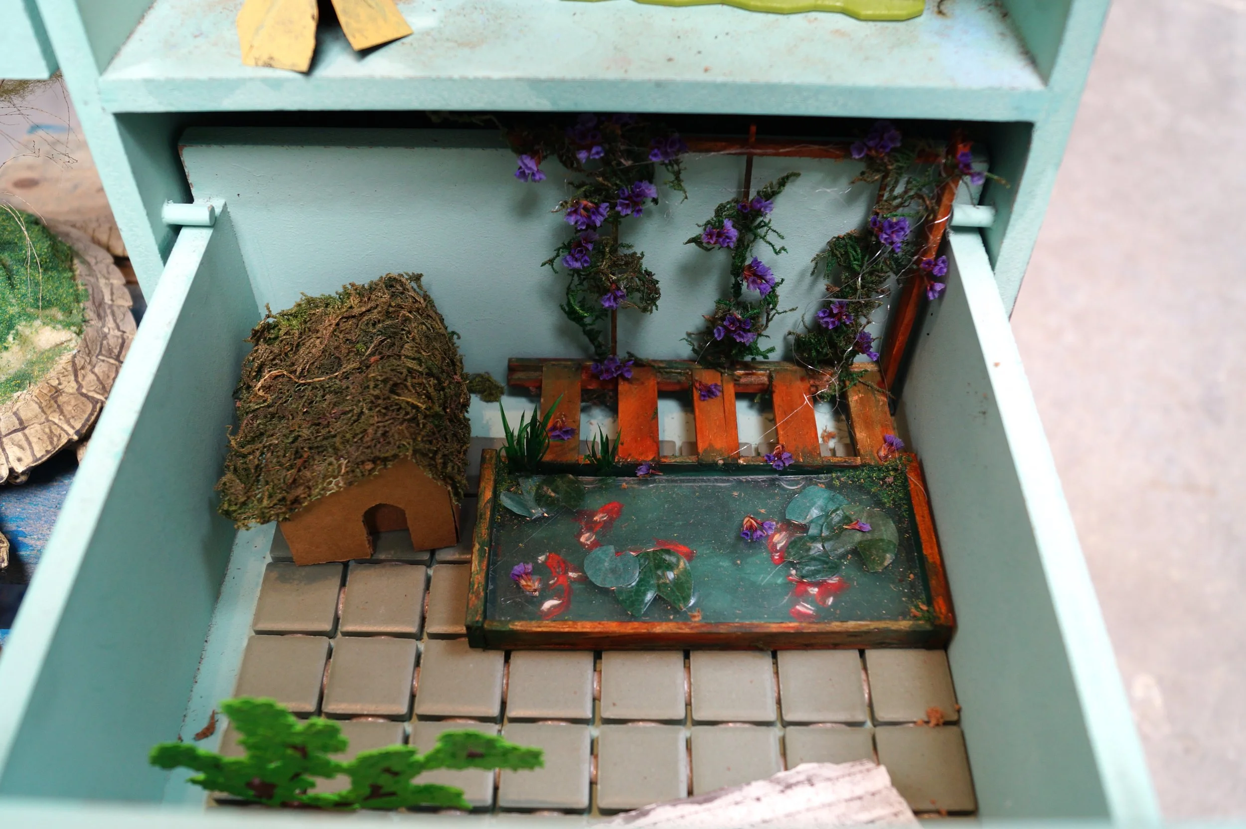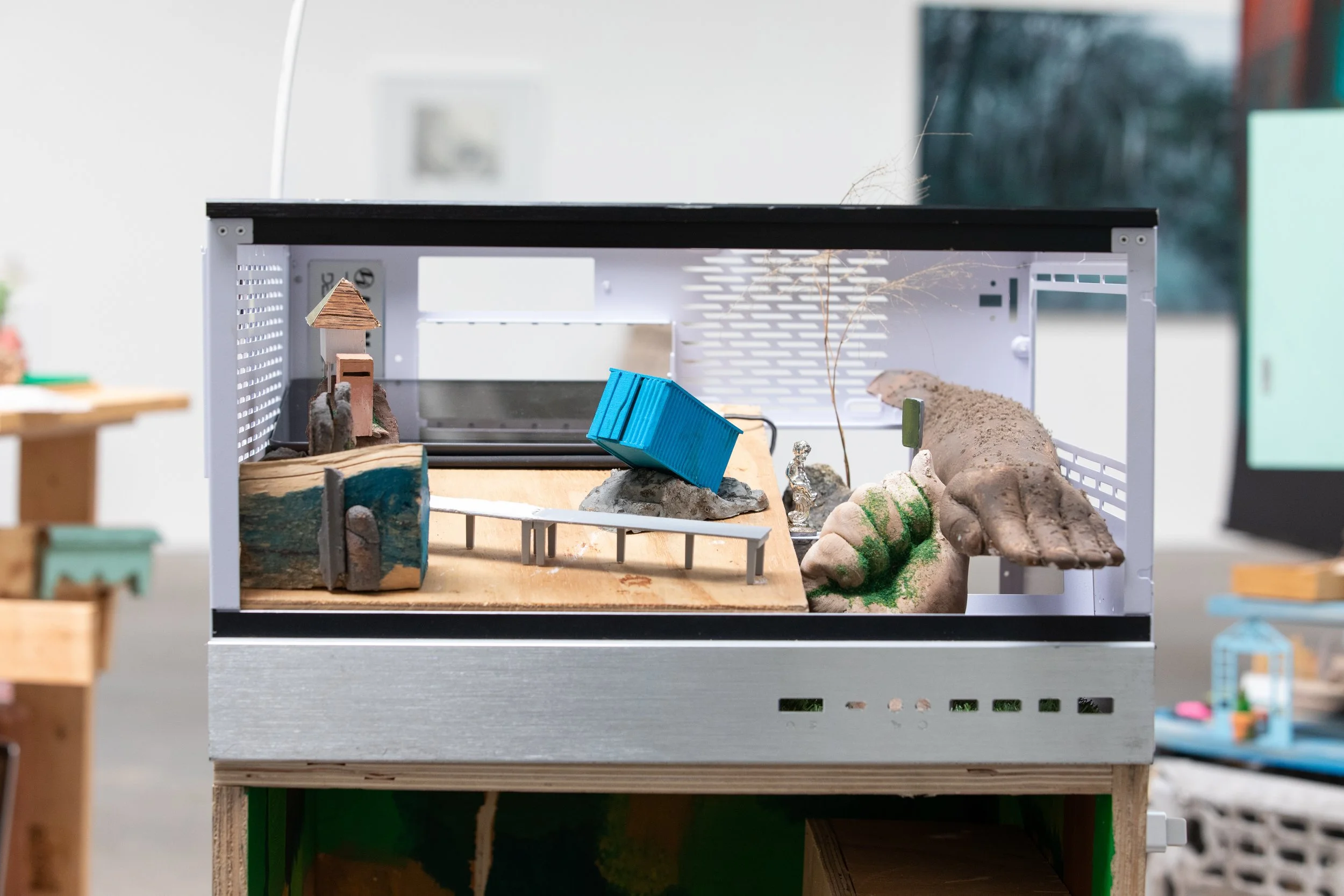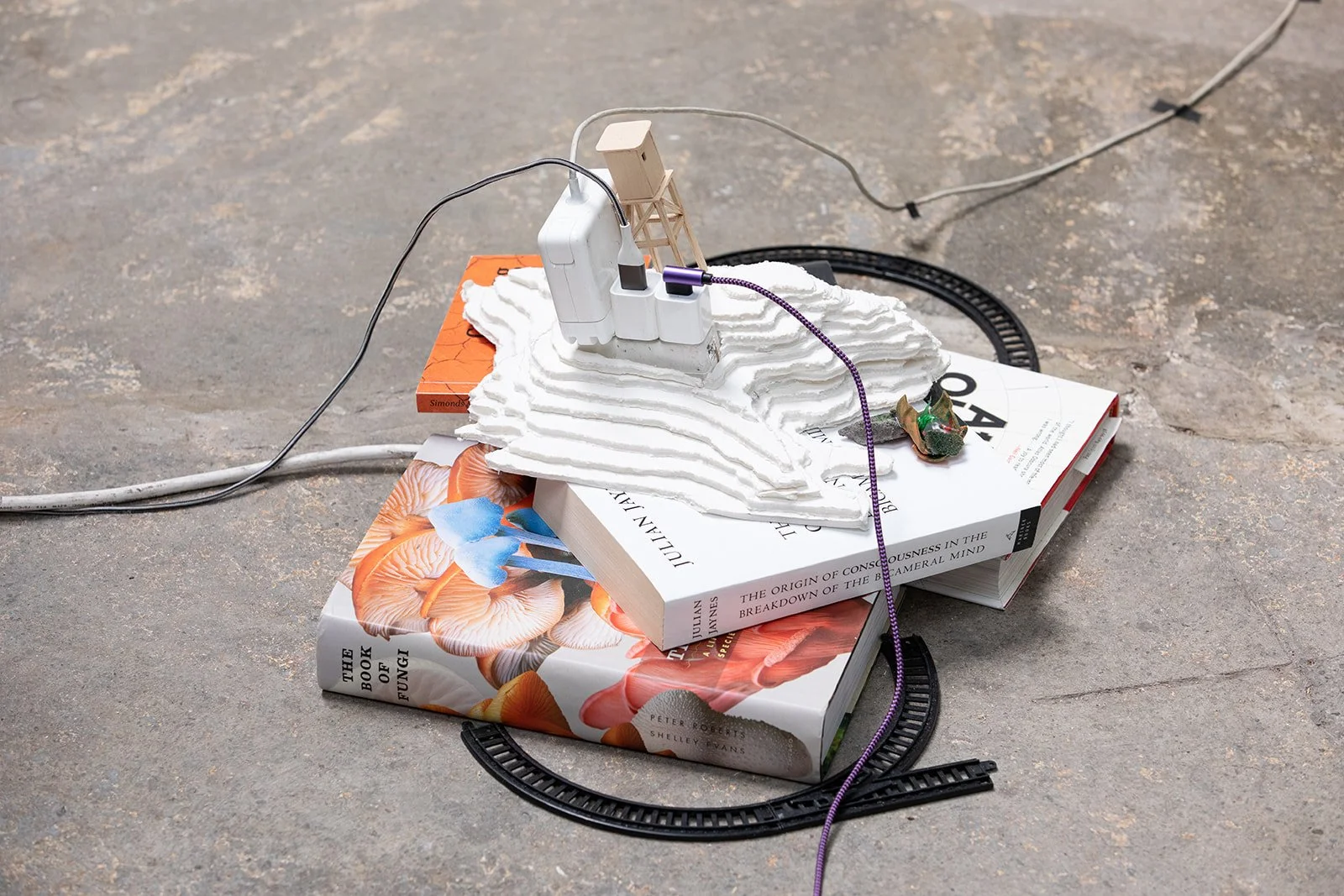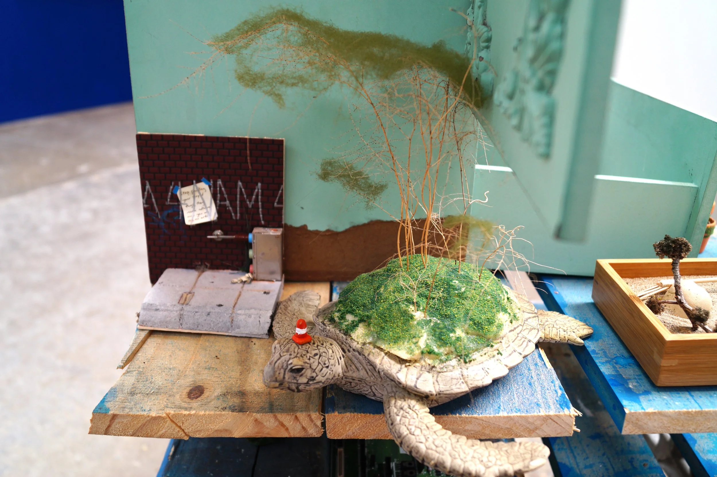 Of Sedimental Skin is a multi-piece installation comprised of different architectural miniatures located on three adjacent stages, each with their own accompanying video dialogue (see Fermented Landscapes and Ticks on the Ethernet Cable). These miniatures are able to be interacted (tactility encouraged) with and can freely be moved on or around the three stages by viewers, performing a physical change in the landscape.